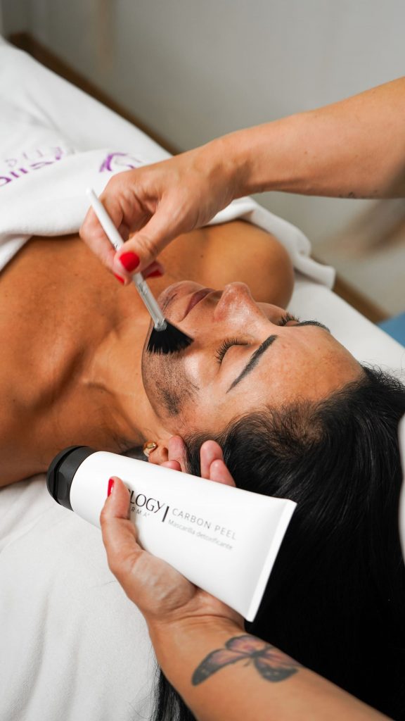 - Aplicación de mascarilla: Se extiende una capa de carbón activado que absorbe impurezas y células muertas.